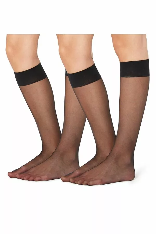 20 denier sheer knee-highs featuring a soft cuff and seamless toe. Each pack contains 2 pairs of knee-highs.