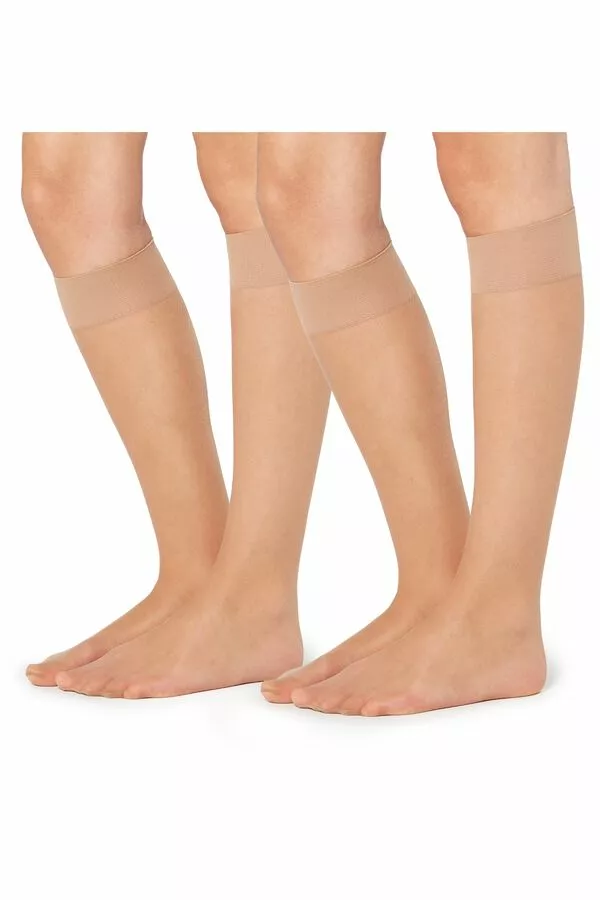 20 denier sheer knee-highs featuring a soft cuff and seamless toe. Each pack contains 2 pairs of knee-highs.