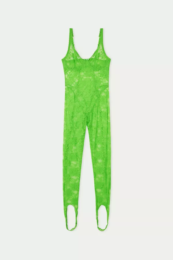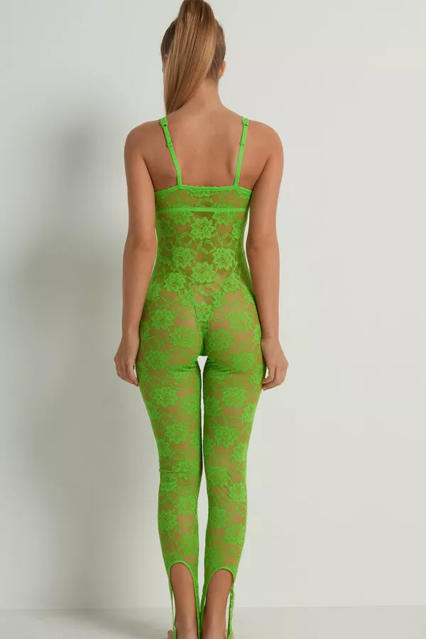 Long unpadded jumpsuit with underwire, made of floral-motif lace with bow appliqué on the center of the bust. Adjustable straps and stirrups.