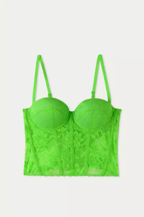 Bustier-effect bandeau bra top with ultra-padded, underwire cups, made of floral-motif lace. Thin straps and hook-and-eye back closure.