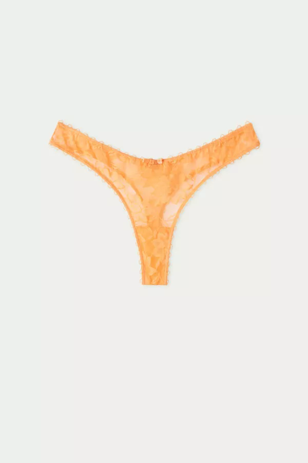 High V-cut thong made of floral-motif lace with bow appliqué.
