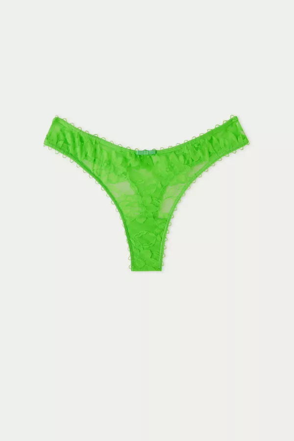 High V-cut thong made of floral-motif lace with bow appliqué.