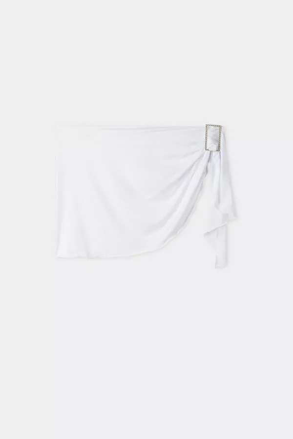 Mini pareo skirt made of white microfiber with rhinestone jewel detail. May also be used as a piece of swimwear worn over the matching bottoms.