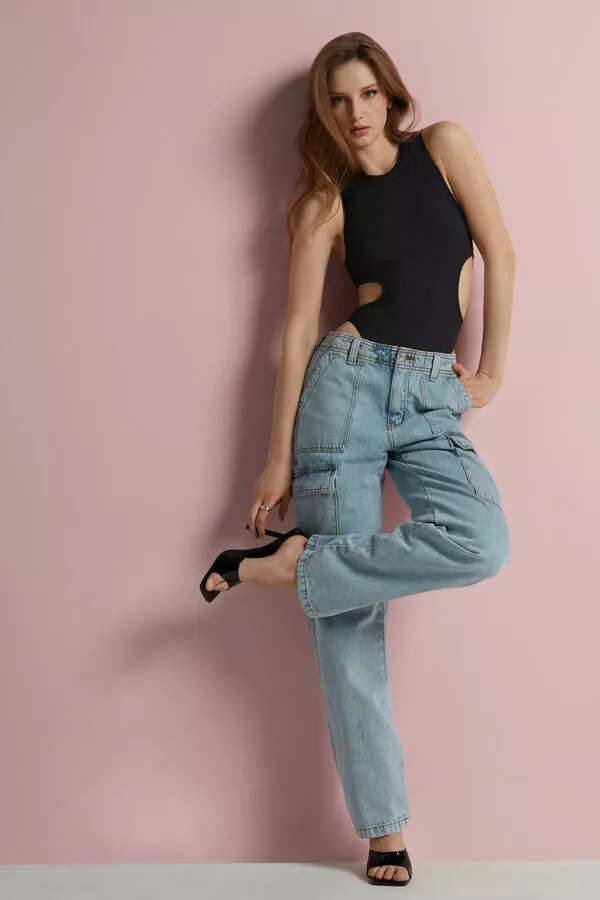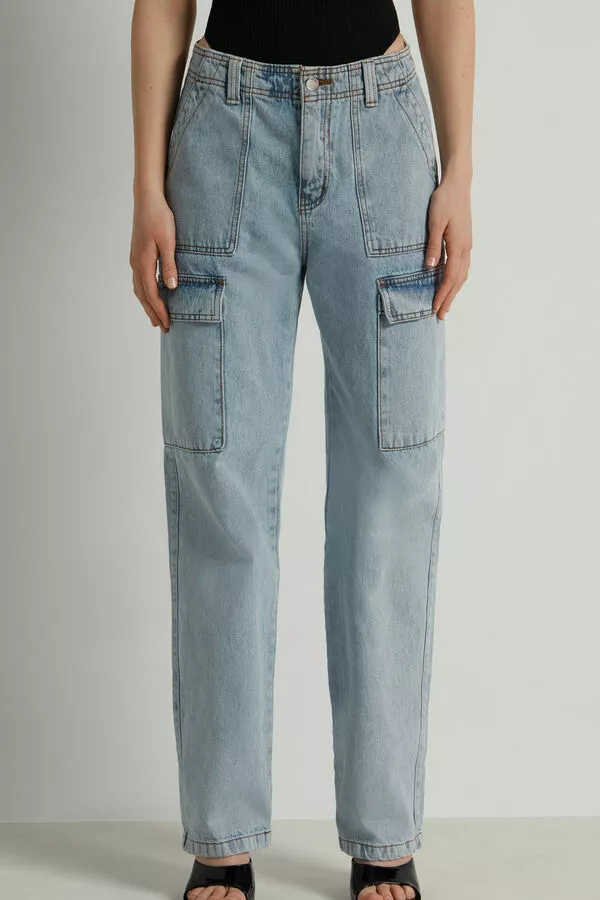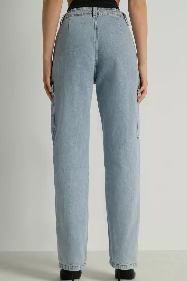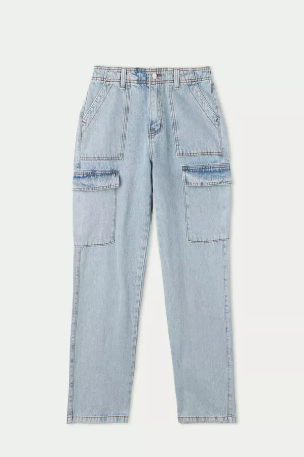 High rise denim pants with large pockets and belt loops. Relaxed fit.