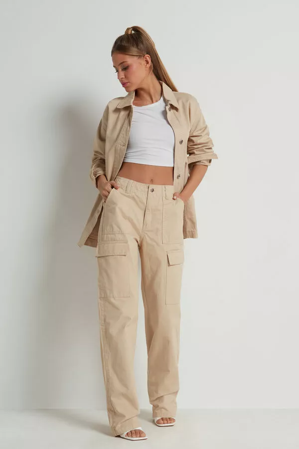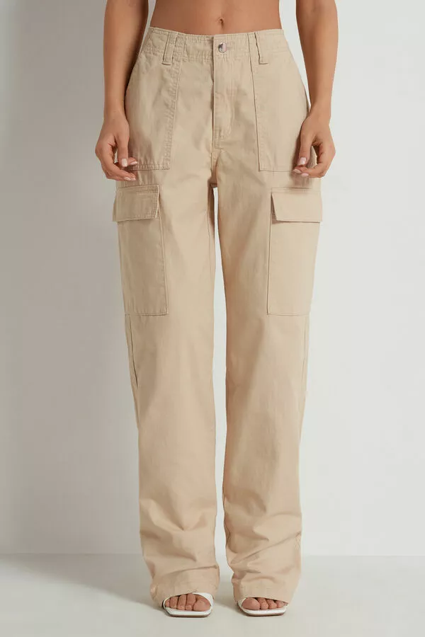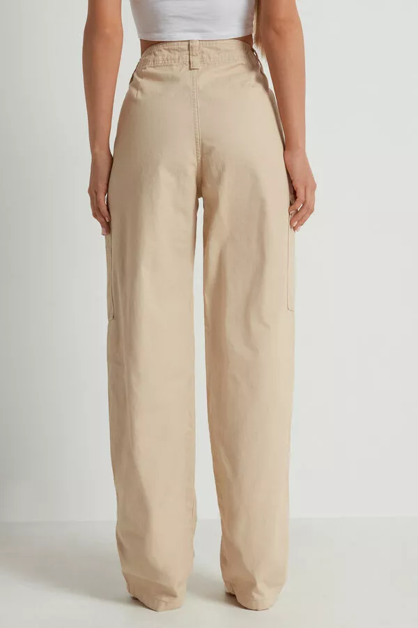 High rise denim pants with large pockets and belt loops. Relaxed fit.