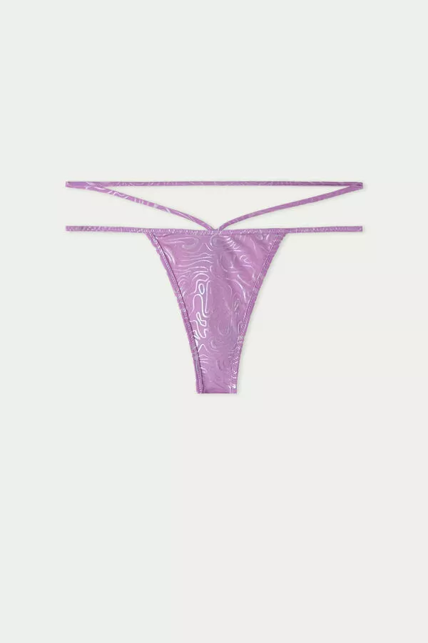 High-cut thong with two thin side strings with an iridescent laminated effect pattern.