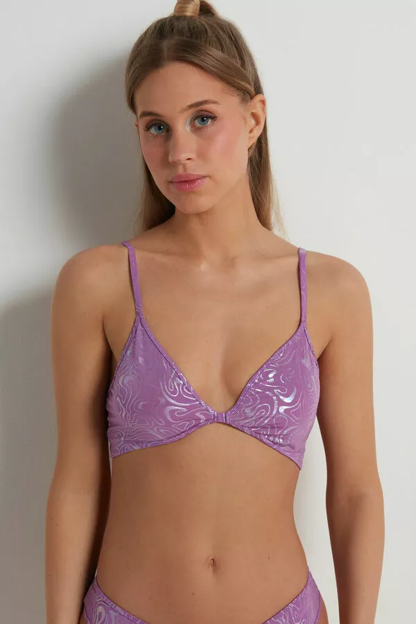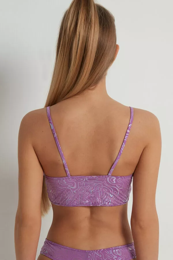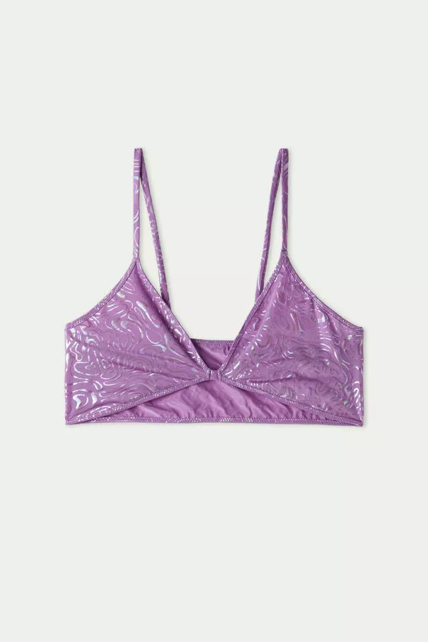 Wireless bra top with unpadded triangle cups, with iridescent laminated effect pattern.