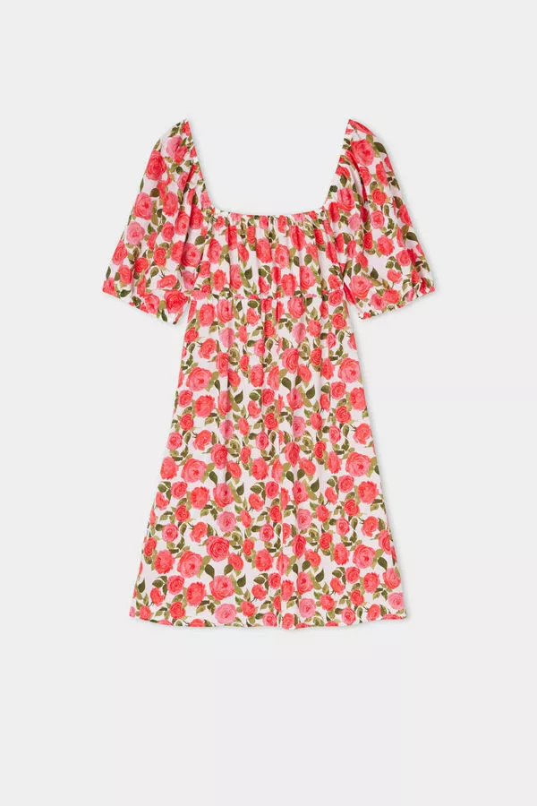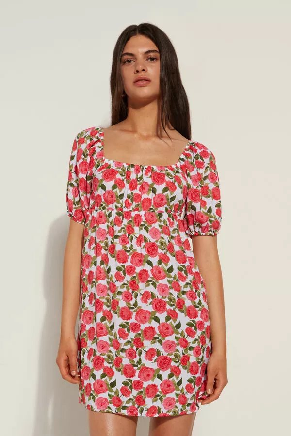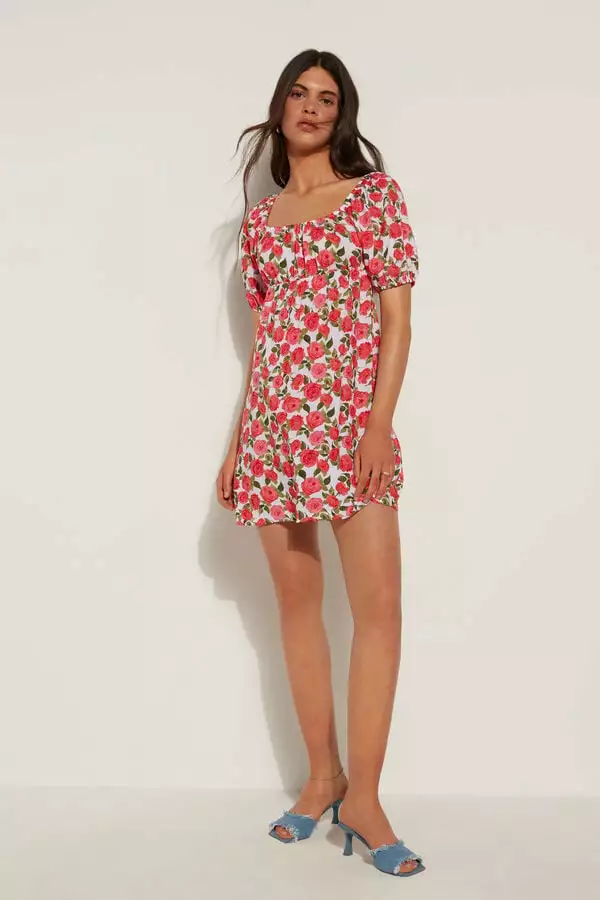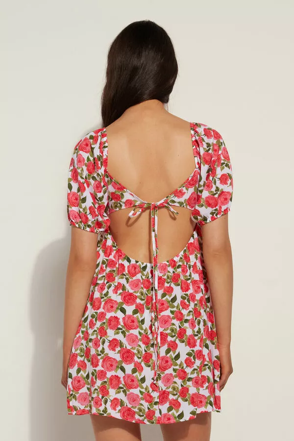 Viscose mini dress with puffed half sleeves, square neck and open back with laces. Flared skirt.