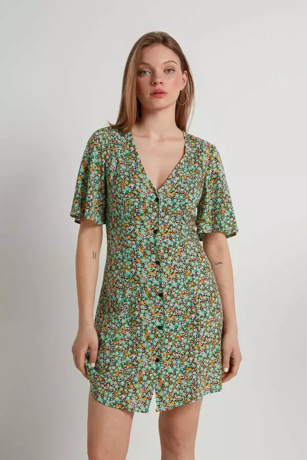Button-down dress in viscose fabric with V-neck and half sleeves. Loose fit.
