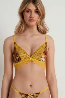 Havana triangle bra with plunging V-neckline, lightly padded cups and no underwire, made of tiger print fabric and contrasting color lace with a bow appliqué. Perfect for women looking for a bra offering ultimate comfort with a natural look. Adjustable straps and triple hook-and-eye back closure with four rows of hooks. In sizes 38B and up, the number of hook-and-eye fastenings and the size of the straps may vary to ensure a better fit and comfort.
