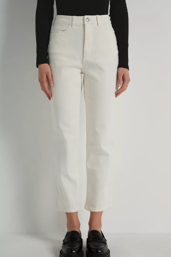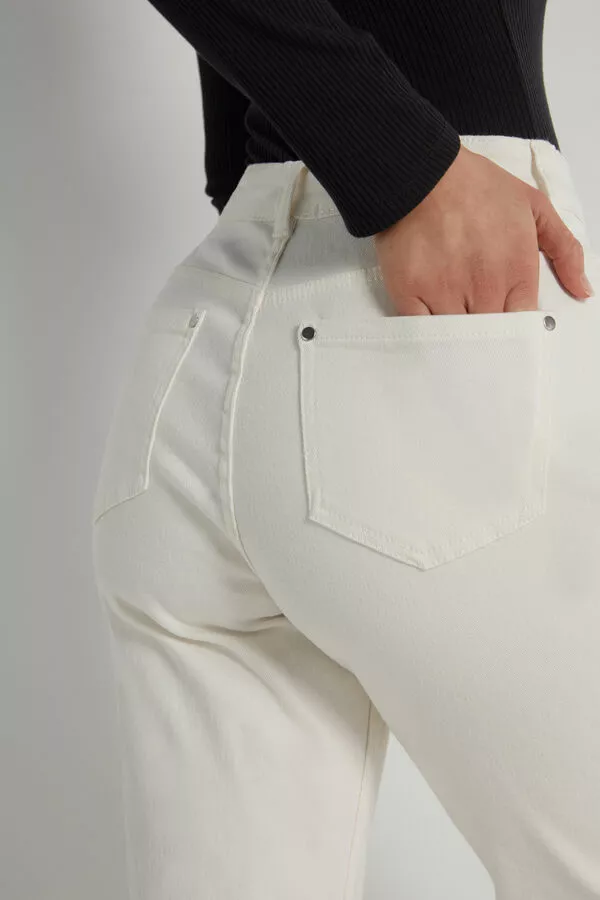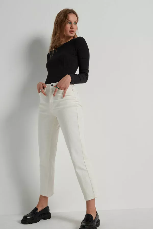 High waist five pocket denim pants with slightly wide, straight legs, and zip and button closure.