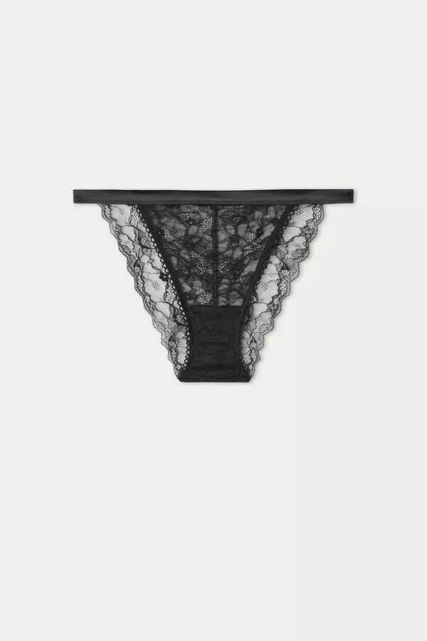 High-waist string panties made of lightweight lace, edged with scalloped trim and satin details.