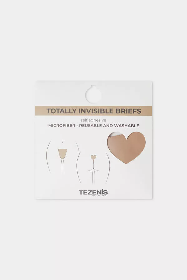 Invisible thong, made of microfiber with adhesive on the front and back and no sides. Washable and reusable.