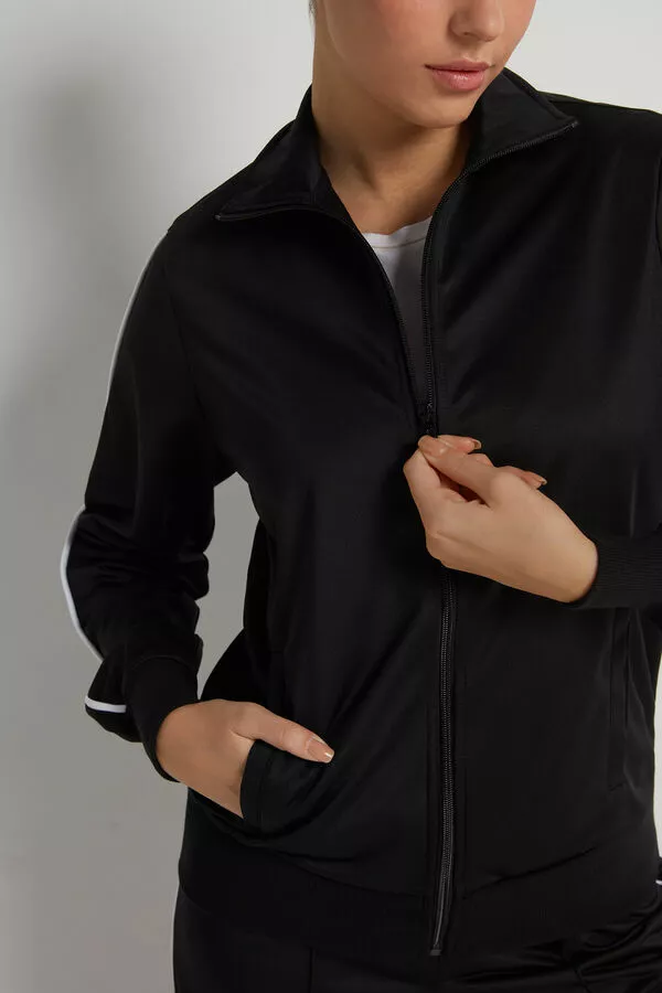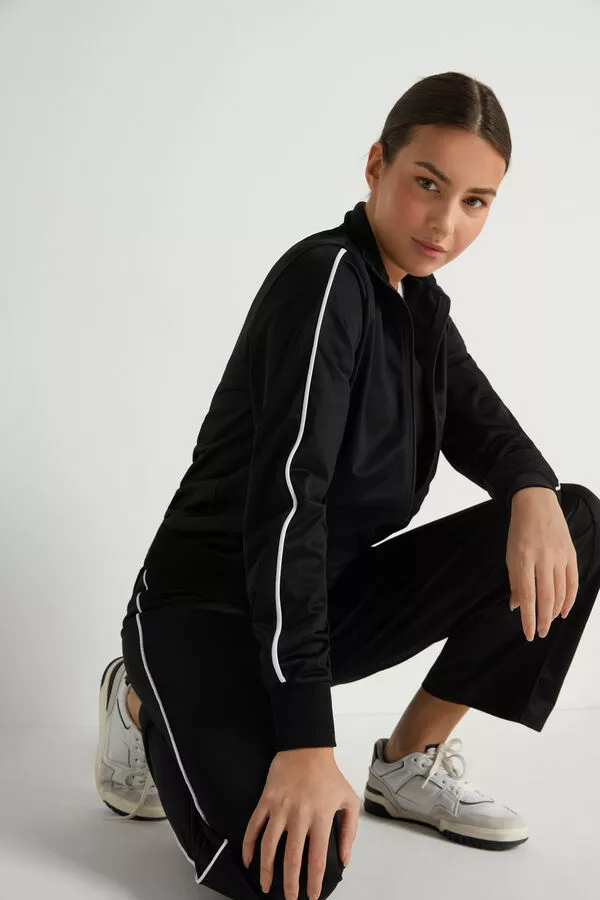 Zip-up sweatshirt with mock neck, side pockets, cuffs and piping down the sleeves. Paired with the knit sweatpants with piping.