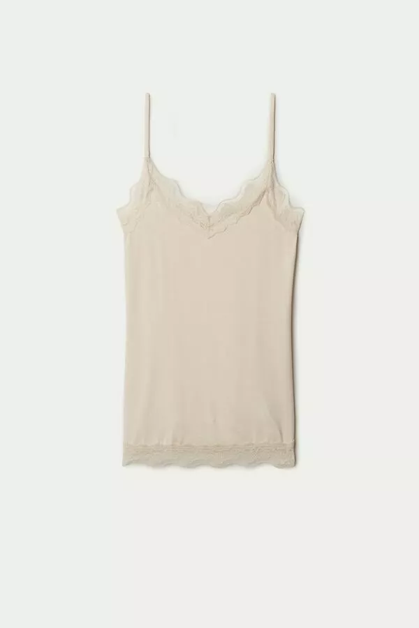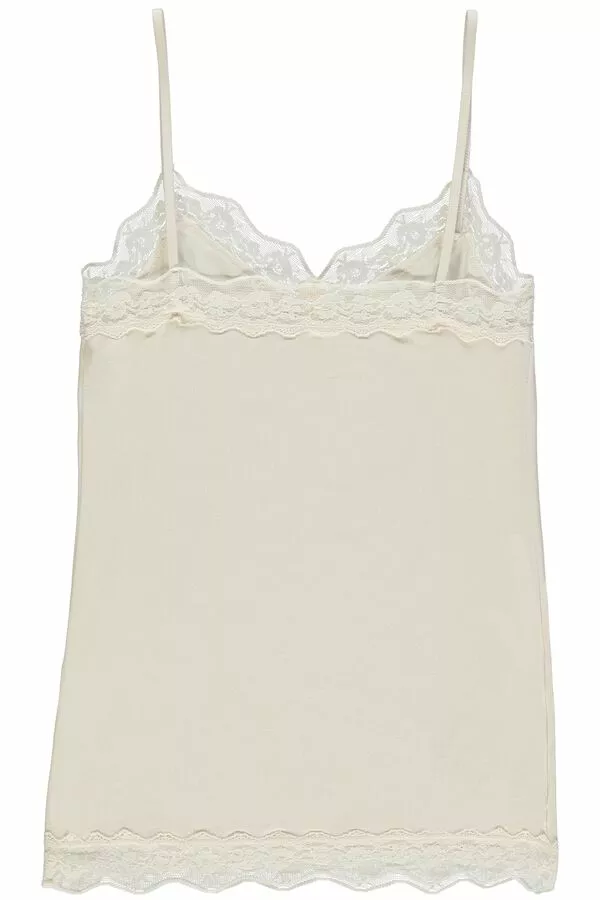 Tank top with skinny straps and lace embellishment on the V-neck and hem. This item is made with certified viscose which allows the reduction of CO2e emissions and the use of water by 50% compared to traditional viscose for the production of this fibre. The cellulose used for the creation of this fibre comes from sustainably managed forests harvested from certified and controlled sources.