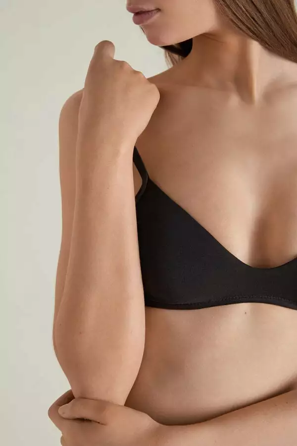 Lisbon non-wired bralette with unpadded triangular cups in two-layer stretch cotton. Adjustable shoulder straps and single four-width hook adjustment. Ideal first bra or for those seeking natural support. Also suitable for sport.