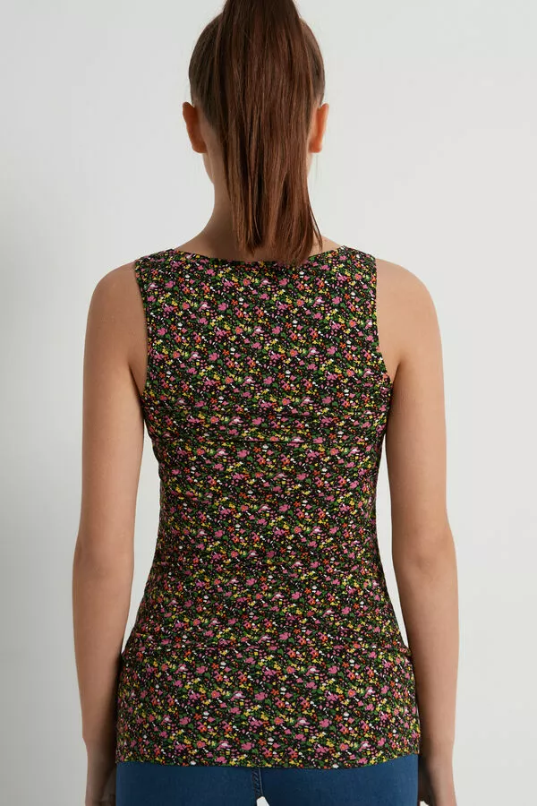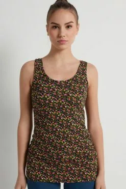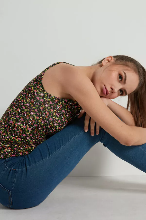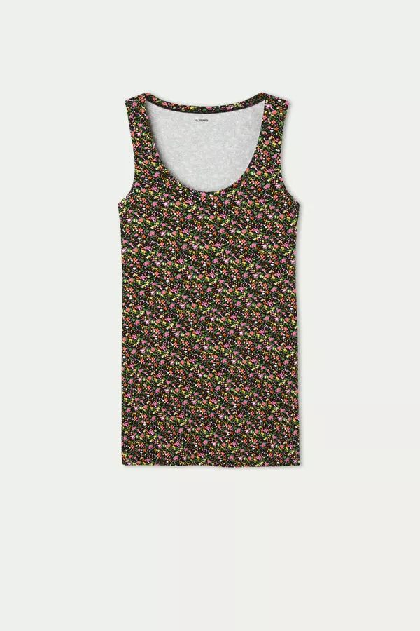 Long printed viscose camisole with wide shoulder straps and crew neck. Tight fit.