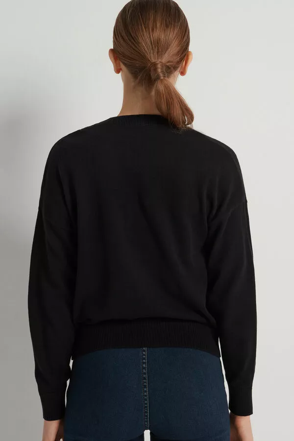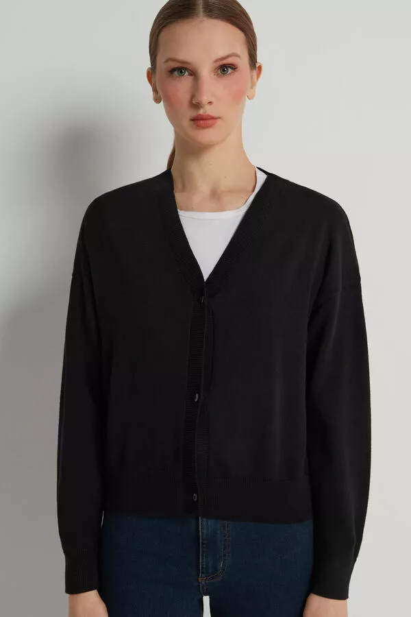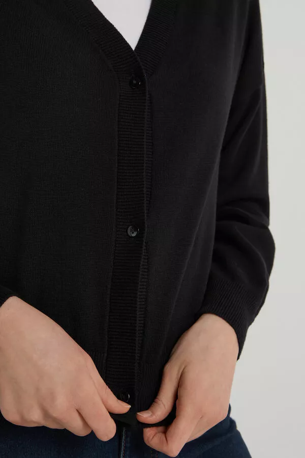 Long-sleeve button-down cardigan with V-neck and drop shoulders. Waist length.