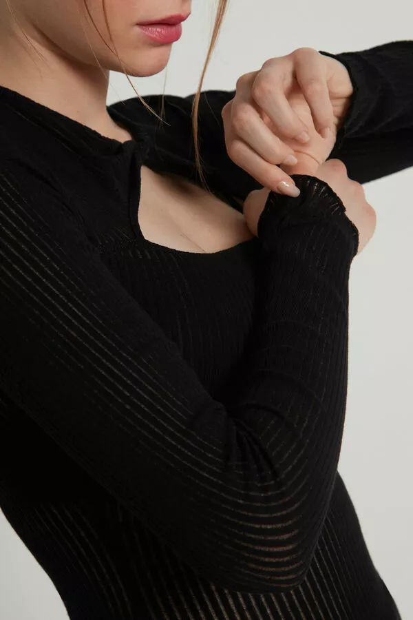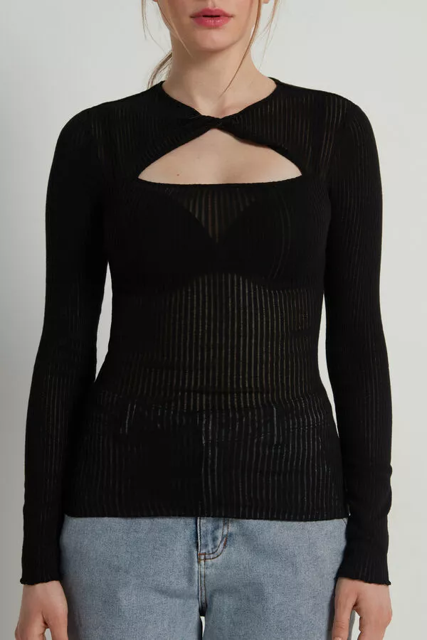 Long-sleeve crew-neck top made of ultralight ribbed cotton with cut-out detail on the neckline. Tight fit.