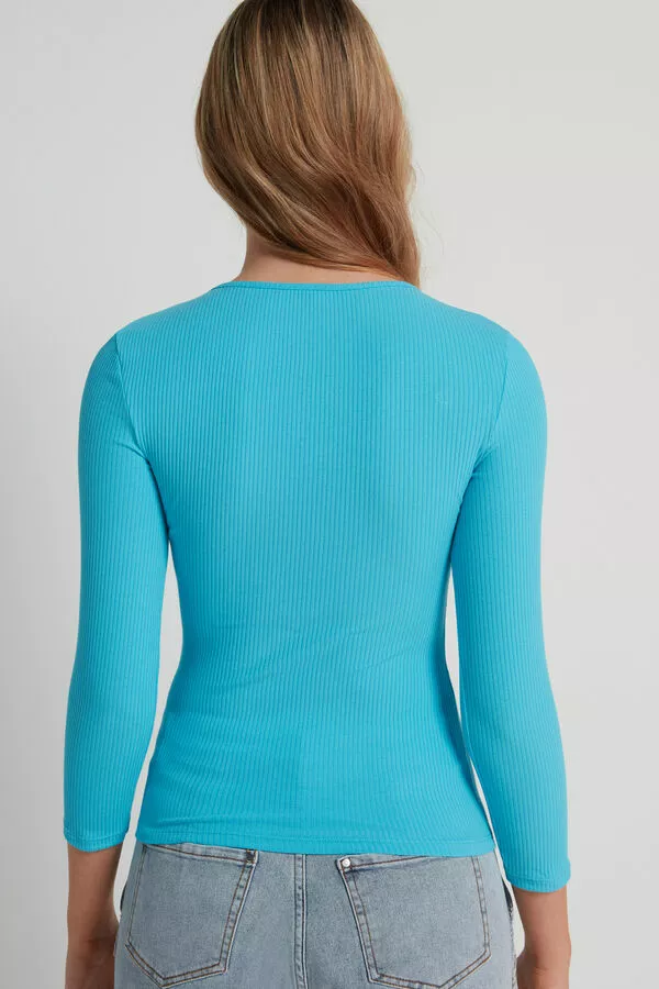 V-neck sweater with 3/4-length sleeves, made of ribbed fabric with criss-cross lacing on the neckline.