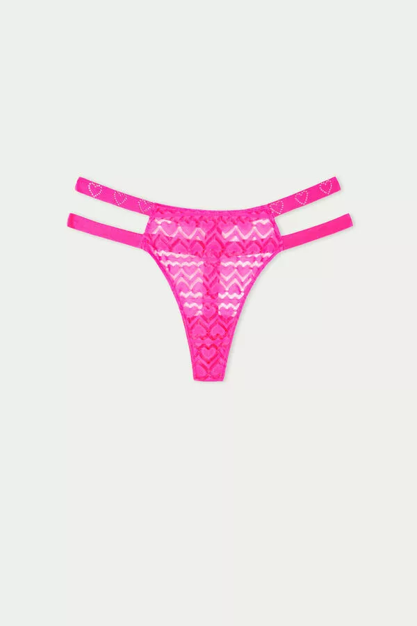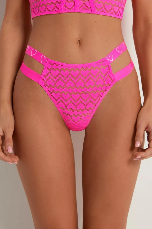 High-waist, high-cut thong made of heart-motif lace with double elastic side straps embellished with rhinestones.