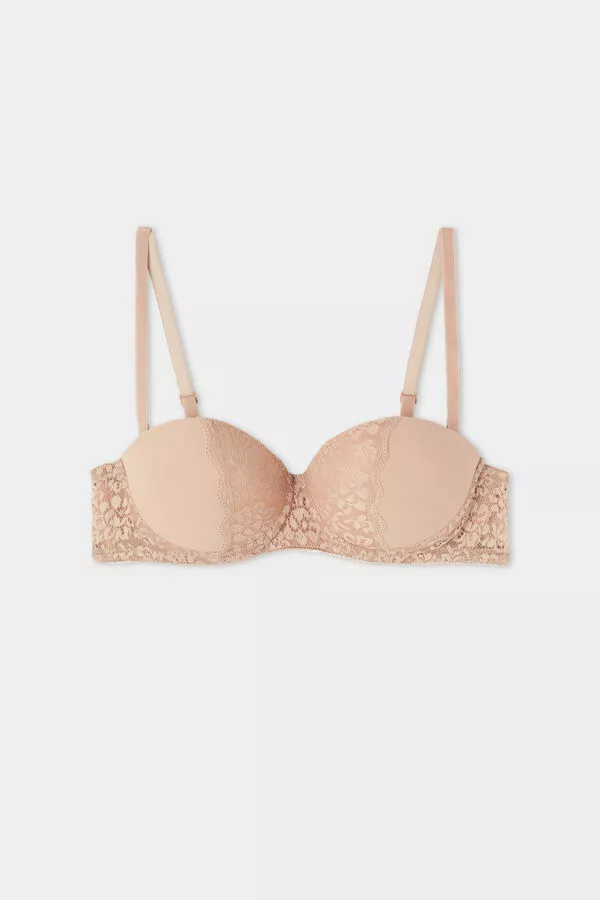 Madrid ultra padded microfiber and recycled lace bandeau bra. Removable straps. Heart-shaped neckline model. The underwire is invisible and side boning ensures good support. Triple back clasps with four rows of hooks. Chest and underbust are lightly siliconized to provide greater adherence. It is perfect for you if you are looking for a model to wear with tops and bandeau dresses or particularly low-cut dresses.