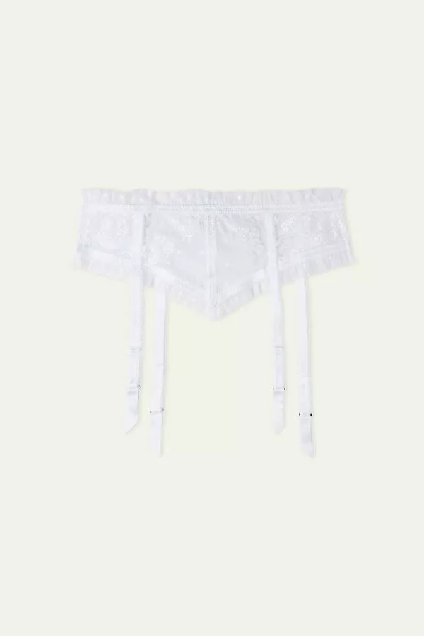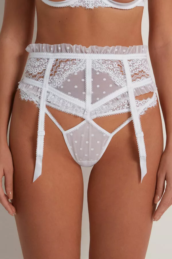 Garter belt made of tulle with flocked polka dots, lace inserts and small ruching.