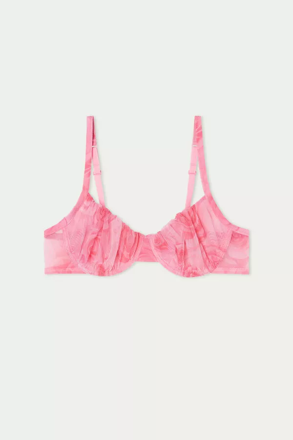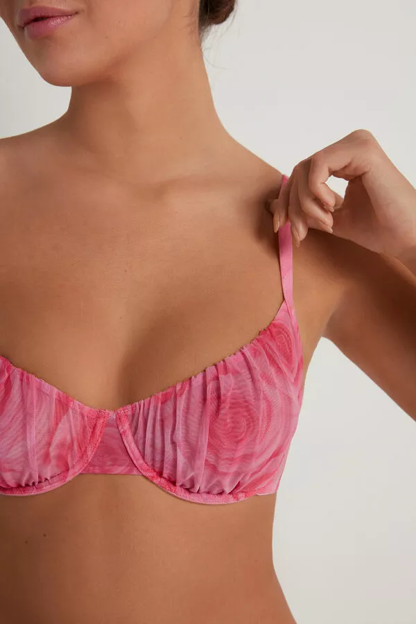 Paris unpadded balconette bra with underwire, made of ruched tulle with rose print. Especially suited for those with larger breasts who want a more natural effect. The straps are adjustable and the double hook-and-eye back closure features four rows of hooks. In sizes 38B and up, the number of hook-and-eye fastenings and the size of the straps may vary to ensure a better fit and comfort.