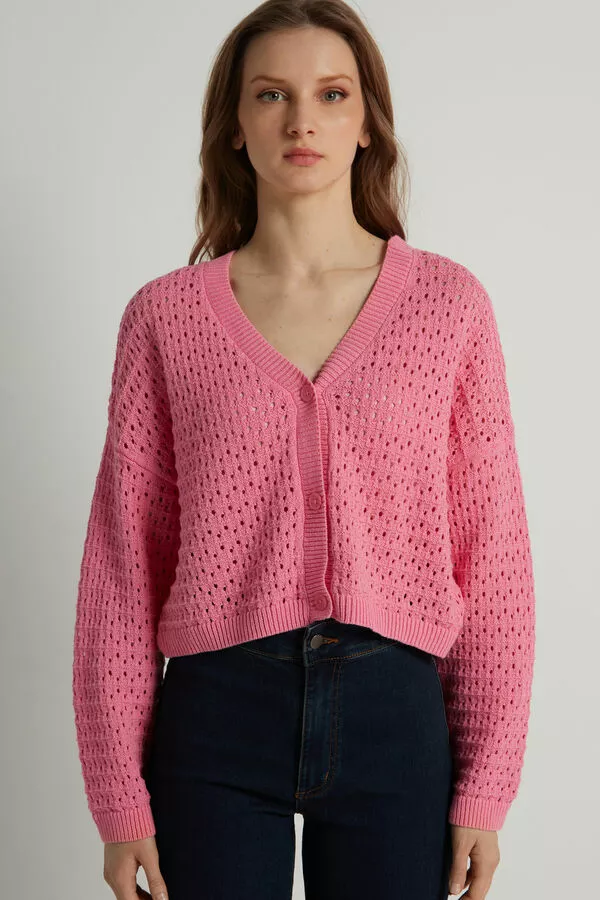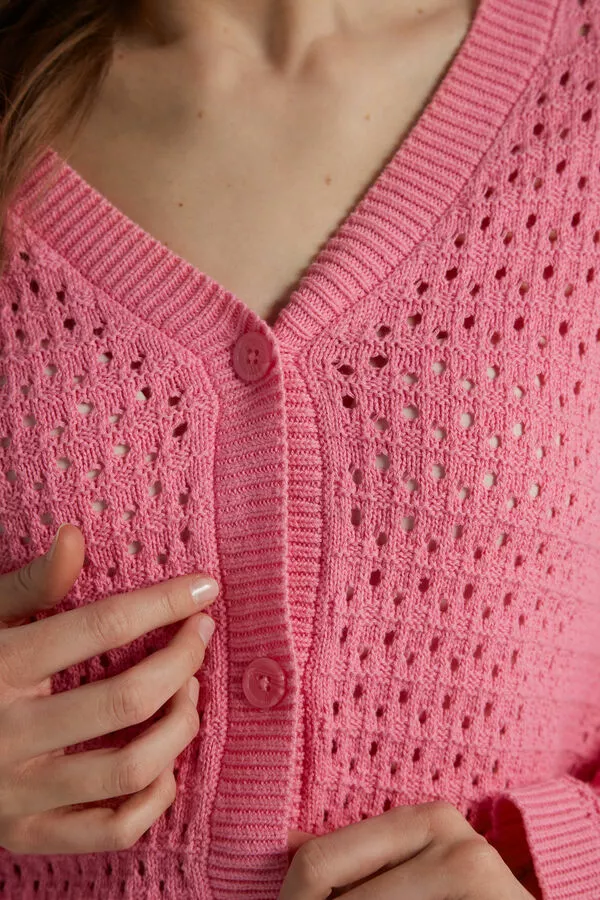 Long-sleeve short cardigan with V-neck, made of perforated cotton with three-button closure.