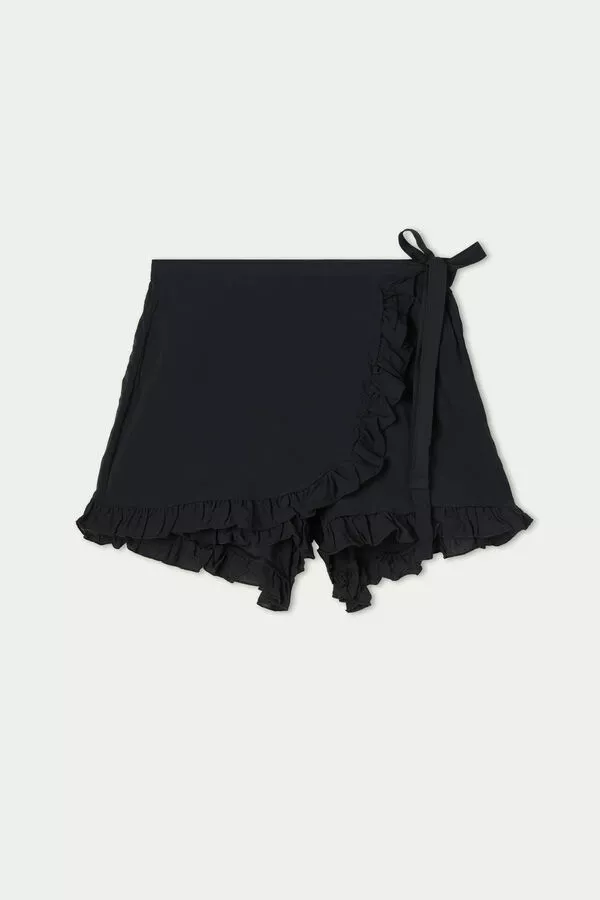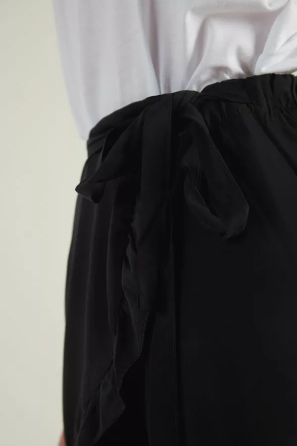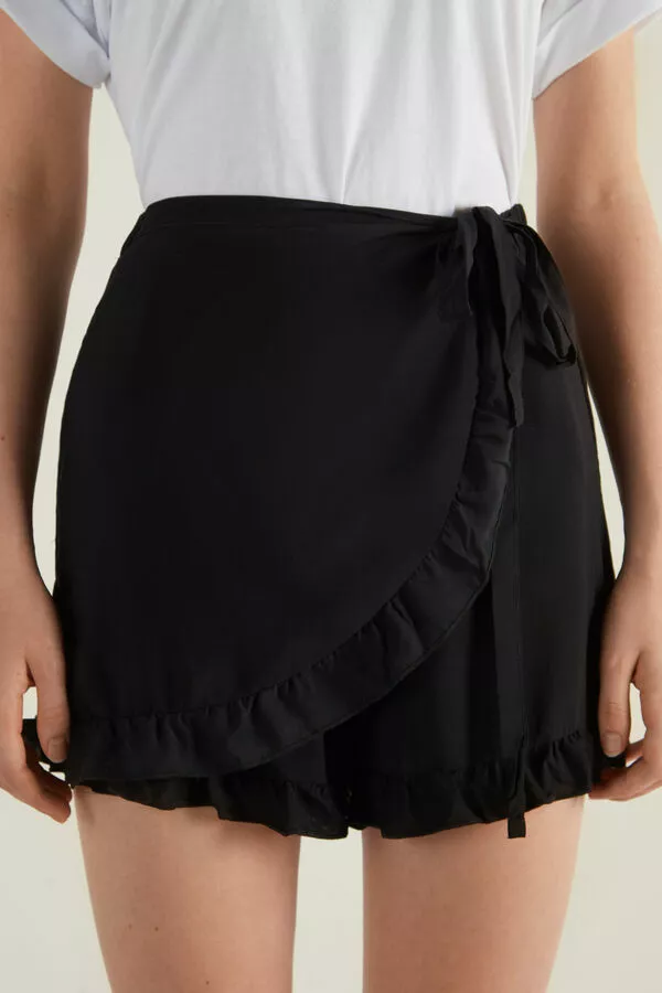 High waist plain weave skort with wrap closure and ruching at the waist.