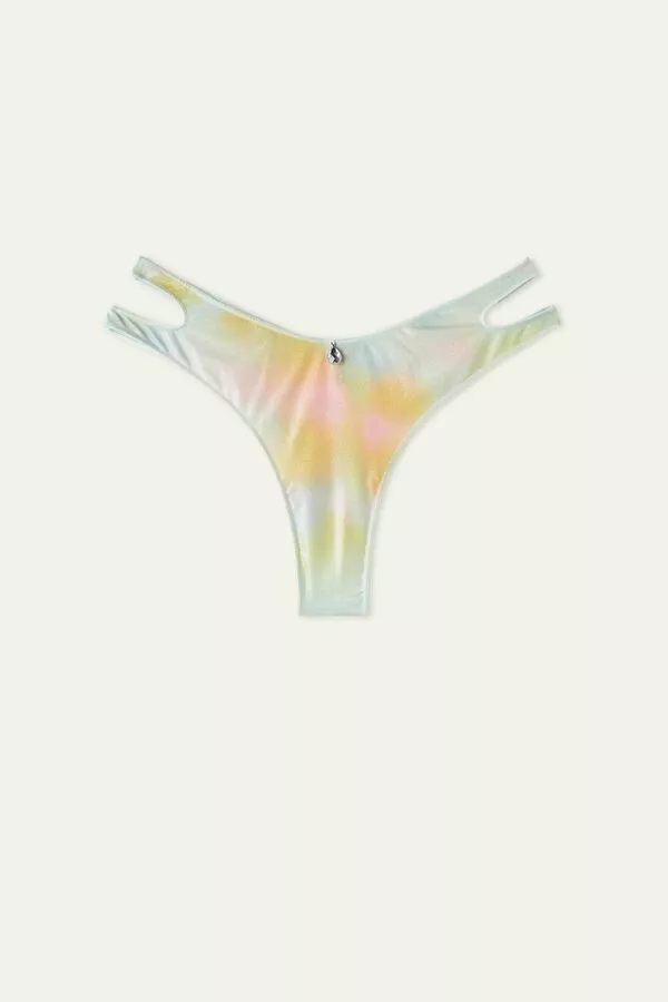High V-cut Brazilian panties made of pastel-colored micro-gradient print fabric with a fine teardrop jewel detail. Cut-out details on the sides.