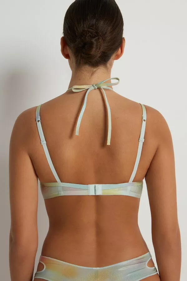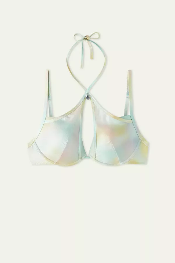 Moscow graduated, padded and underwire push-up bra. Made of pastel-colored micro-gradient print fabric with a fine teardrop jewel detail. Criss-cross lacing detail that ties behind the neck, to enhance the décolleté by creating a voluminous effect. Adjustable straps and single hook-and-eye back closure with four rows of hooks.