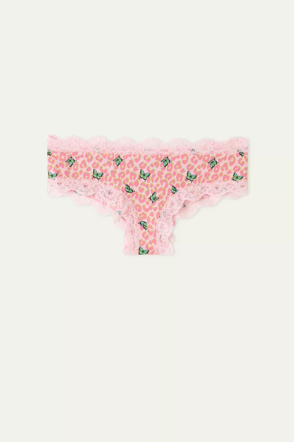 Hipster Brazilian panties in printed microfiber, with lace trim and cotton gusset.