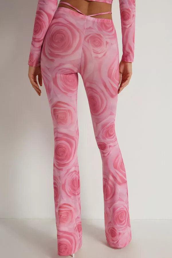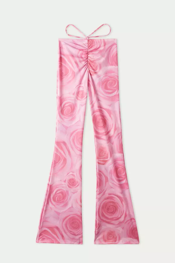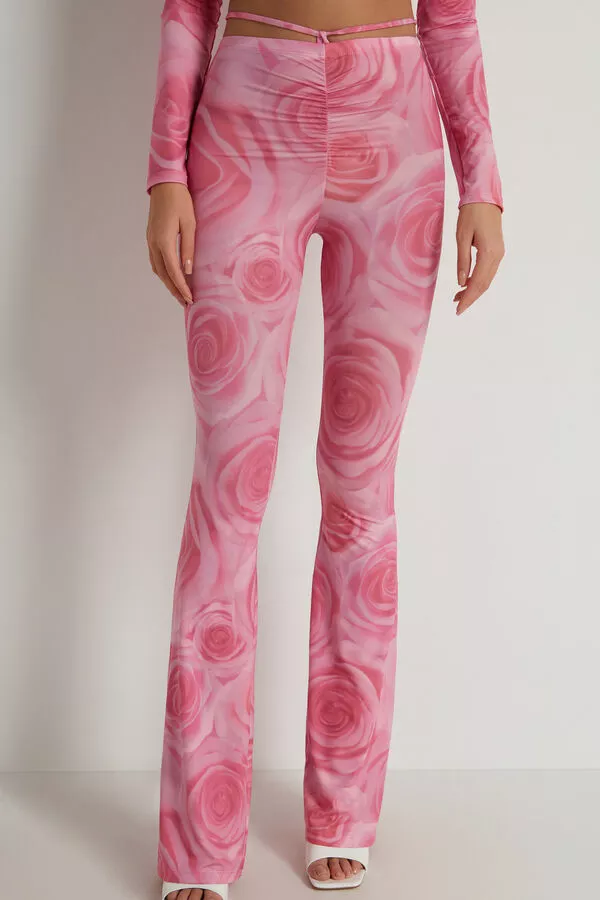 High-waisted yoga dance pants made of printed microfiber, flared at the bottom with decorative ties at the waist.