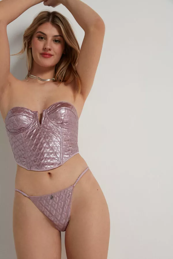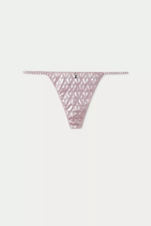High-cut thong with thin side strings, made of a pearlescent pink vinyl-effect material with a heart motif.