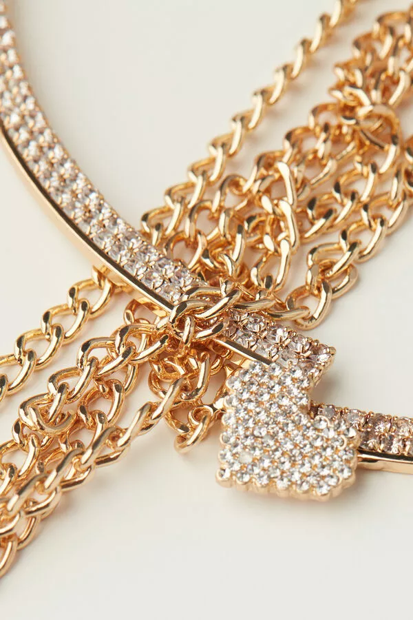 Jewel bra with no cups, made with underwire embellished with rhinestones, featuring small chains and snap hooks.