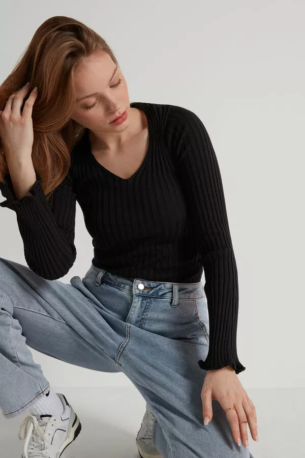 Long-sleeve, V-neck sweater made of ribbed fabric with slightly flared sleeves.