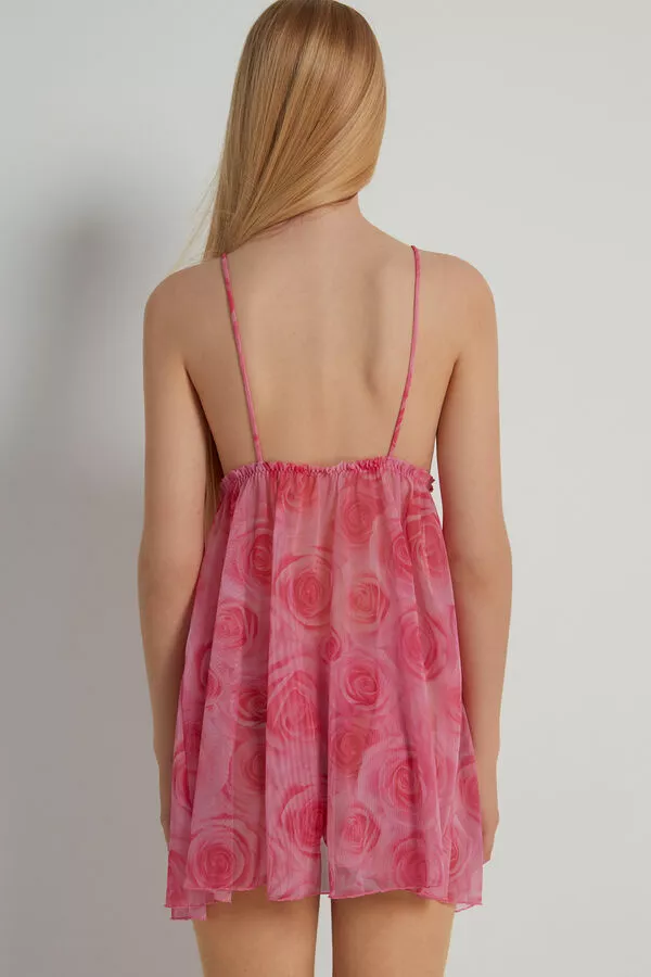 Slip with central opening and thin straps, made of tulle with a rose print, featuring gathering and ruching.