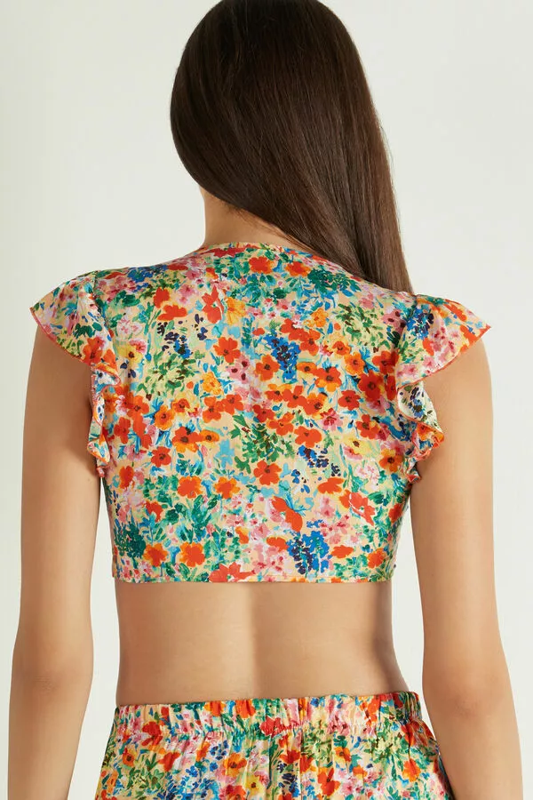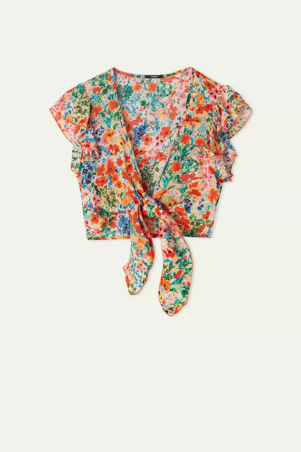 V-neck crop top with ruffled shoulders and adjustable knot in the middle of the chest.