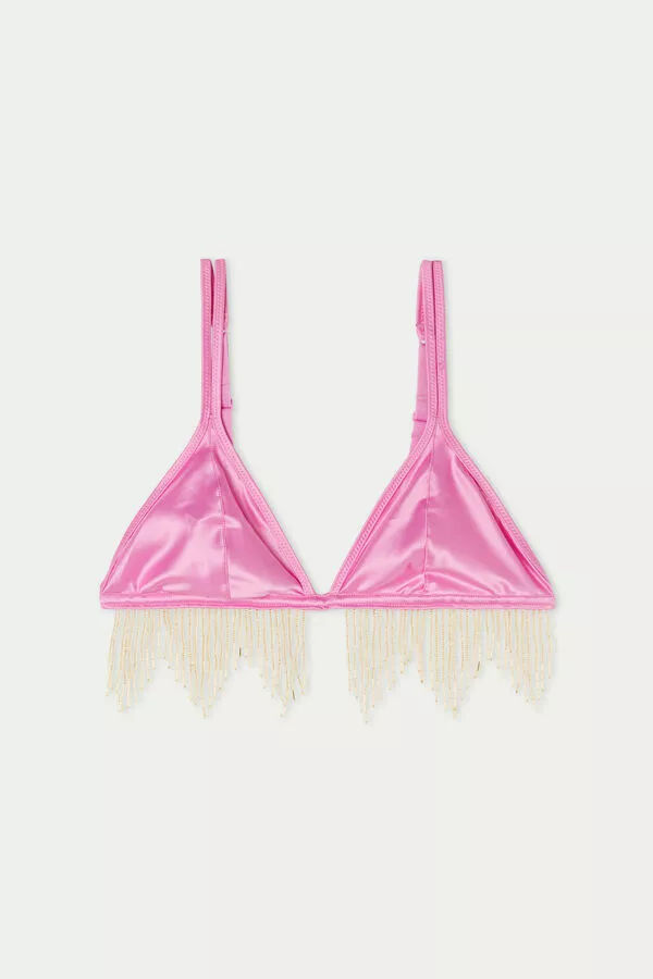 Unpadded, natural-effect triangle bra with a V-neck and no underwire, made of pink satin-finish fabric with beaded fringe under the bust. Adjustable straps and hook-and-eye back closure.