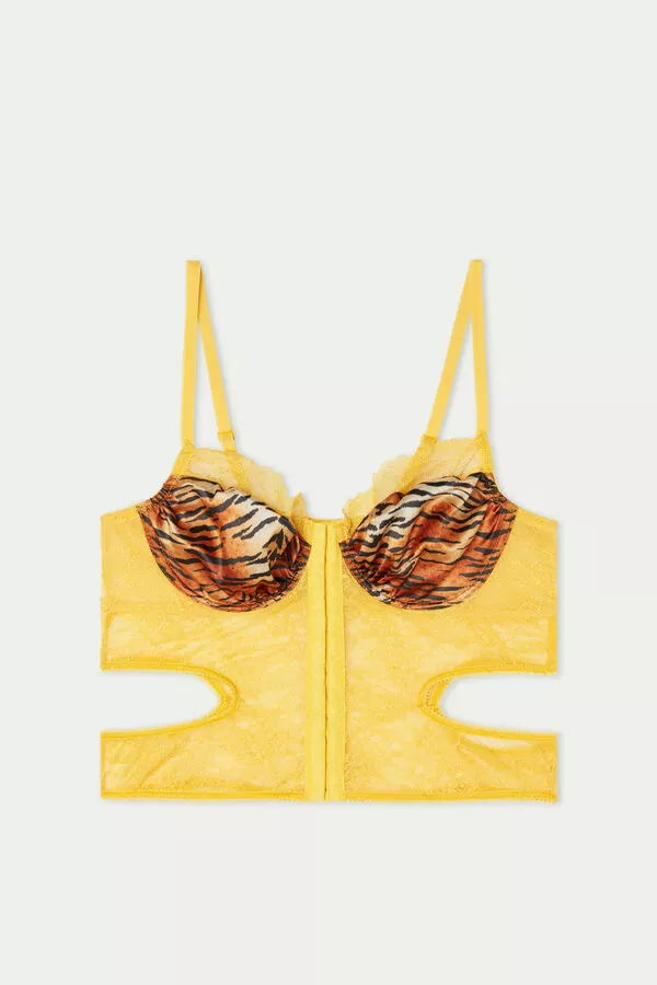 Bra top with unpadded, underwire balconette cups made of tiger print fabric and contrasting color lace, with a central fastening and cut-out details on the sides. Removable straps.