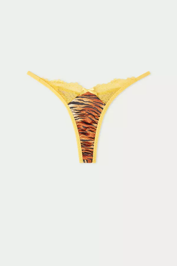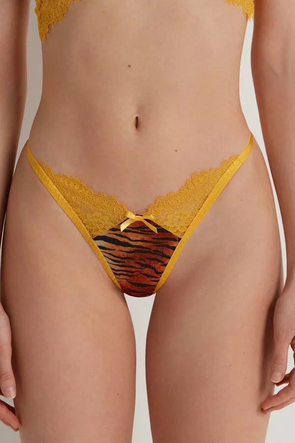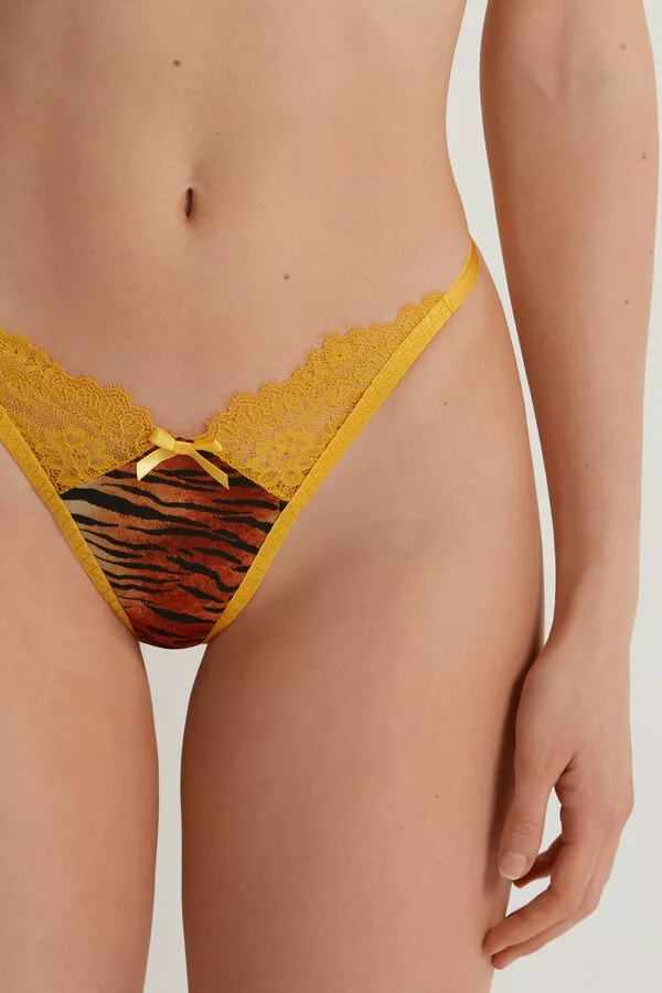 High V-cut Brazilian panties with thin side strings, made of tiger print fabric and contrasting color lace with a bow appliqué.