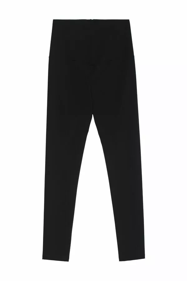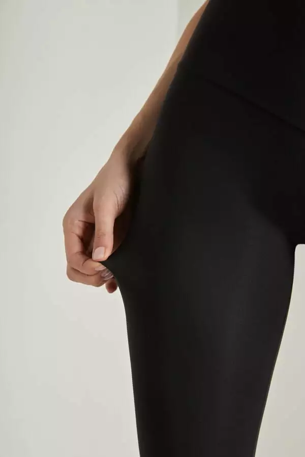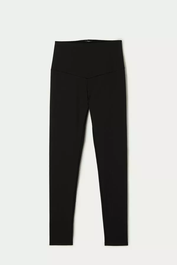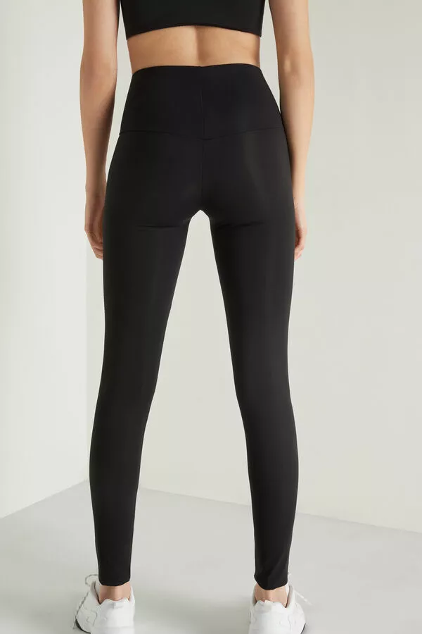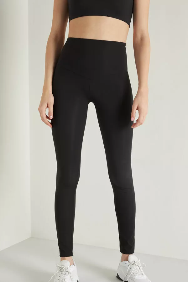 Stretch fabric high-waisted leggings featuring a double-sided band with shaping mesh for a slimming effect.