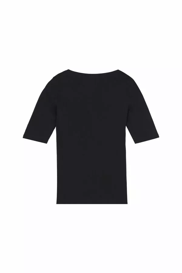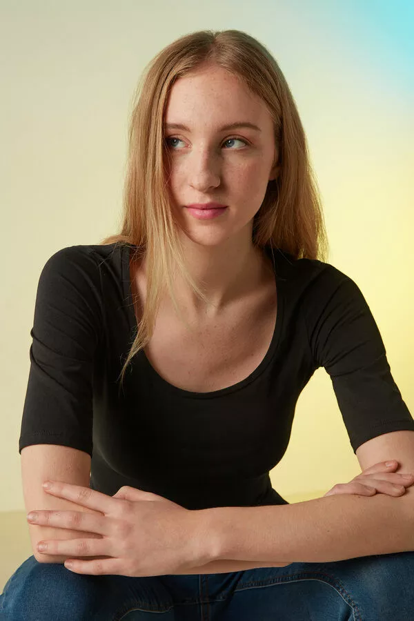 Short sleeve scoop neck top in stretch cotton. The model is 172 cm tall.