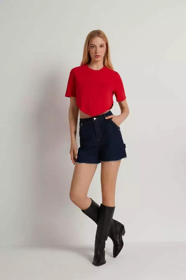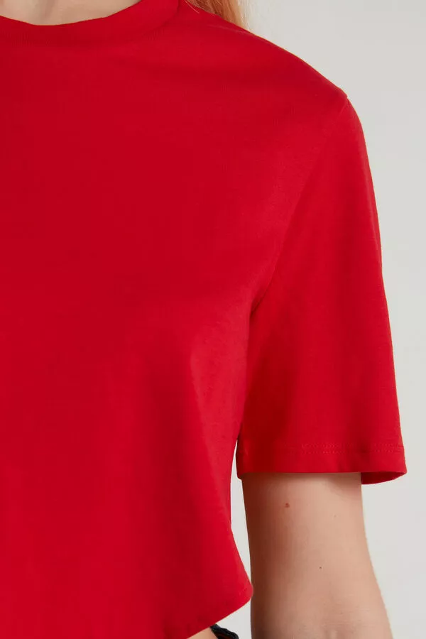 Short-sleeved crop top with crew neck and V cut on the front and back.