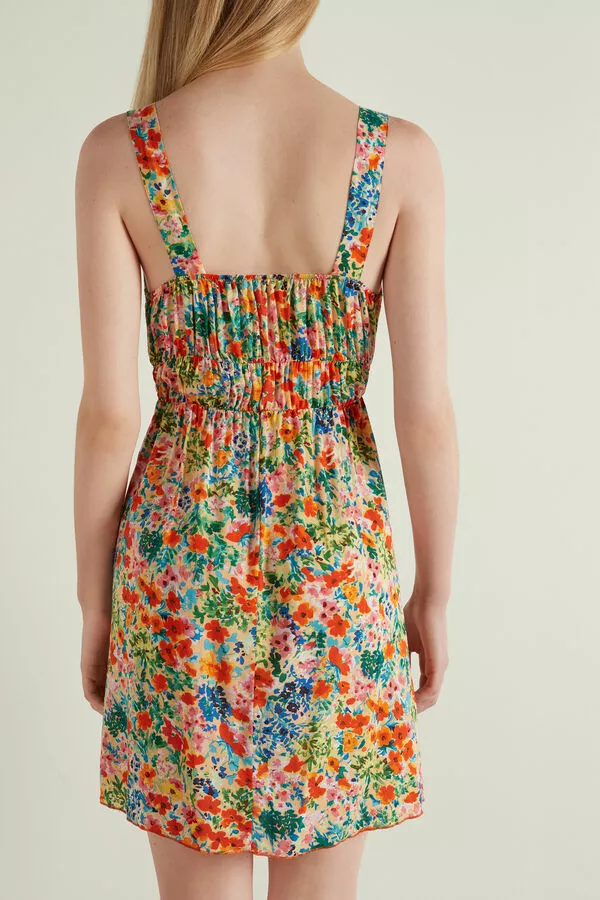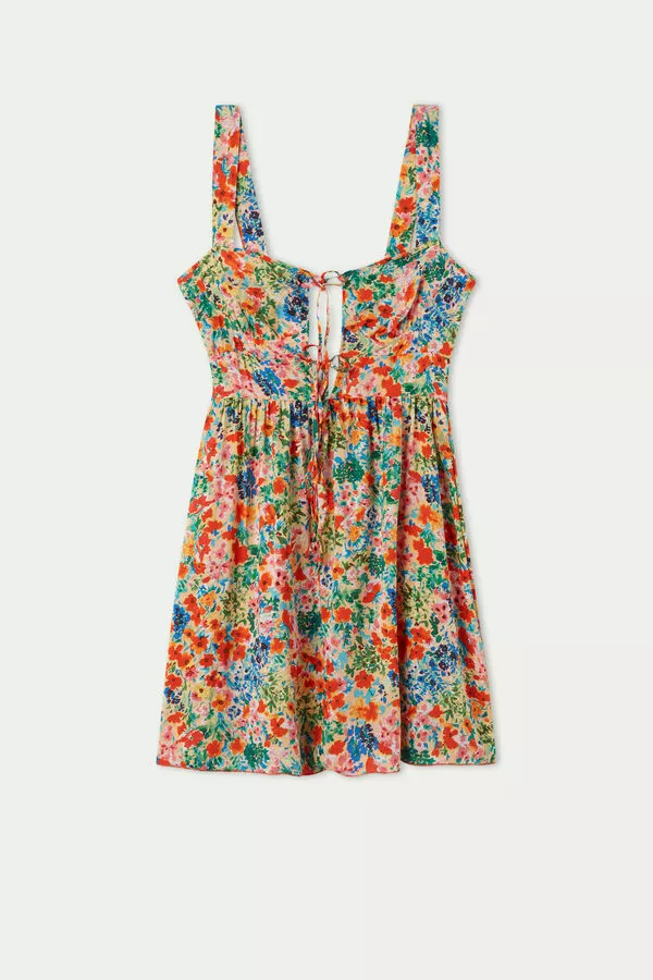 Sleeveless viscose cloth dress with straps and lacing at the décolleté to adjust the neckline to your liking. The elasticized detail on the back makes the dress fit better.