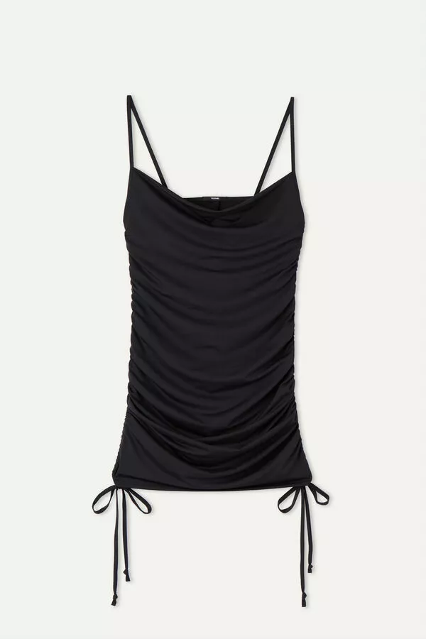 Spaghetti strap dress made of microfiber with no cups. Drawstrings on the sides to adjust the gathered effect. Tight fit.