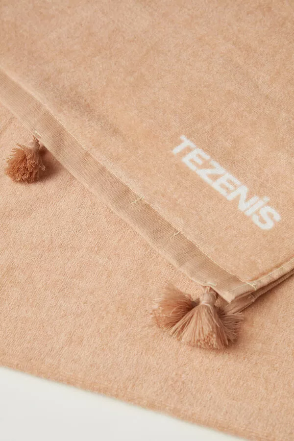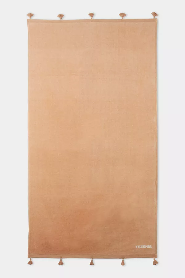 Solid-colored terry cloth beach towel with logo and fringe trim.