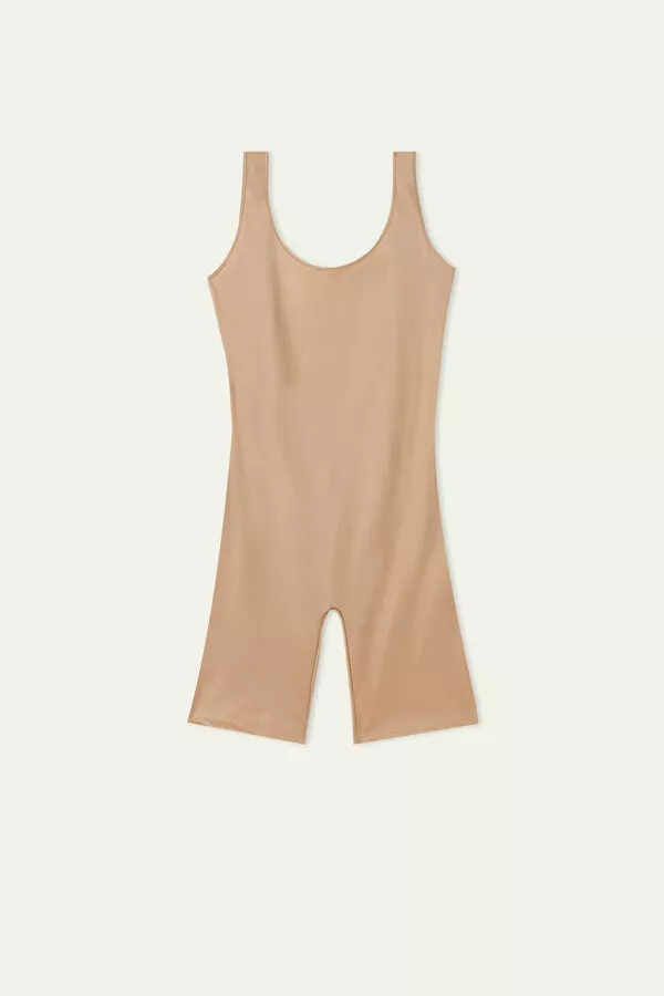 Sleeveless short jumpsuit with round neckline, made of lightweight shiny microfiber with shaping effect.