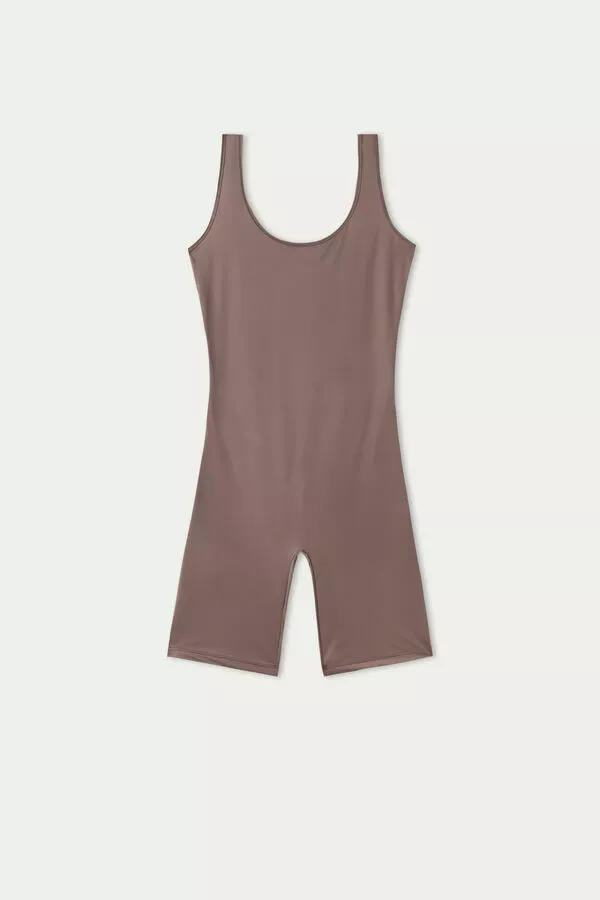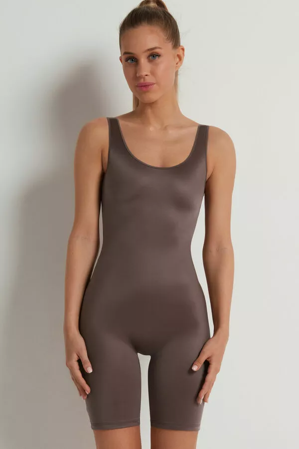 Sleeveless short jumpsuit with round neckline, made of lightweight shiny microfiber with shaping effect.